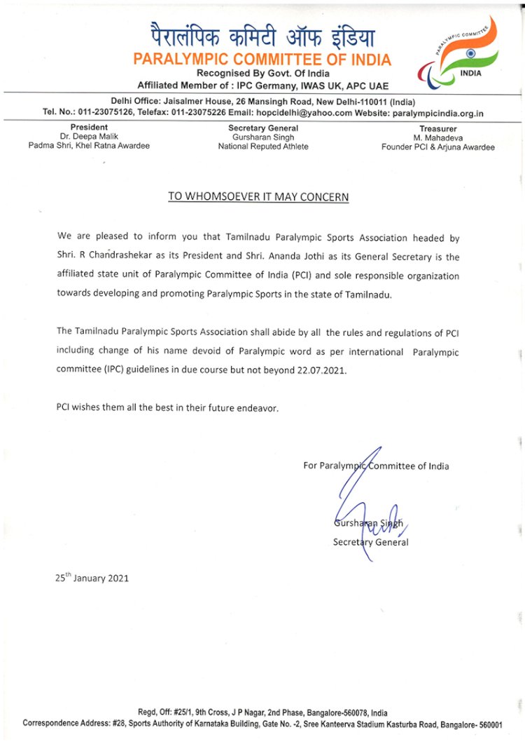 Tamil Nadu Paralympic Committee of India is an Affiliated Member of